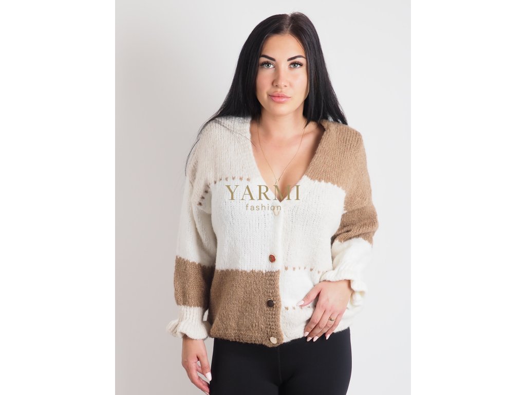 Štýlový dámsky sveter v béžovo-hnedej kombinácii s jemným kontrastným prechodom farieb. Model má voľnejší strih, ktorý pôsobí ležérne a zároveň elegantne. Výstrih do V opticky predlžuje siluetu a dodáva ženský vzhľad.