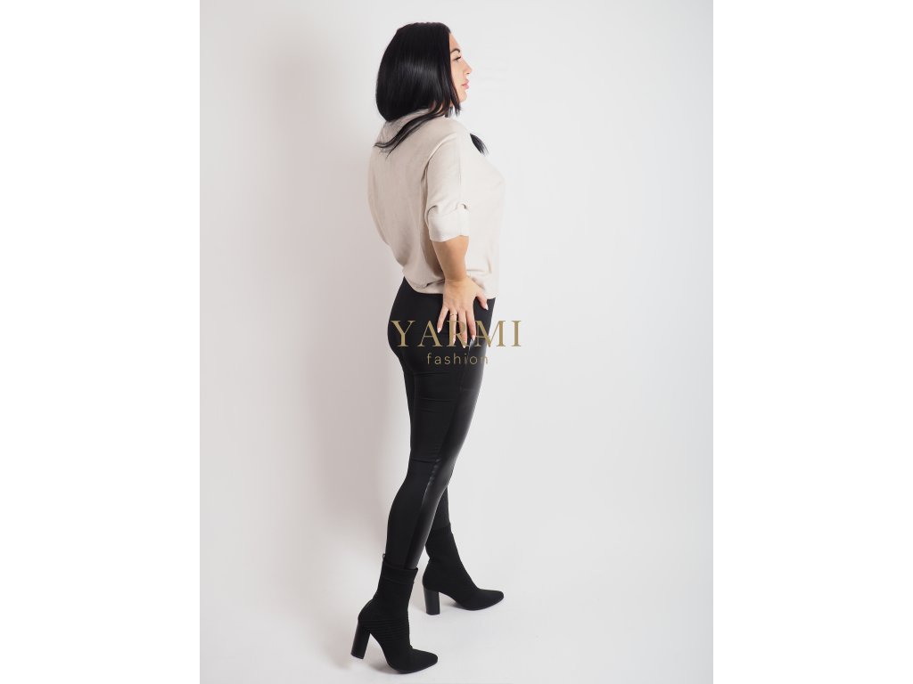 Dámsky sveter v béžovej farbe s jemnou kontrastnou aplikáciou na prednej strane, ktorá dodáva modelu originálny a ženský vzhľad. Má voľnejší strih, vďaka čomu je pohodlný na každodenné nosenie a pekne splýva na postave.