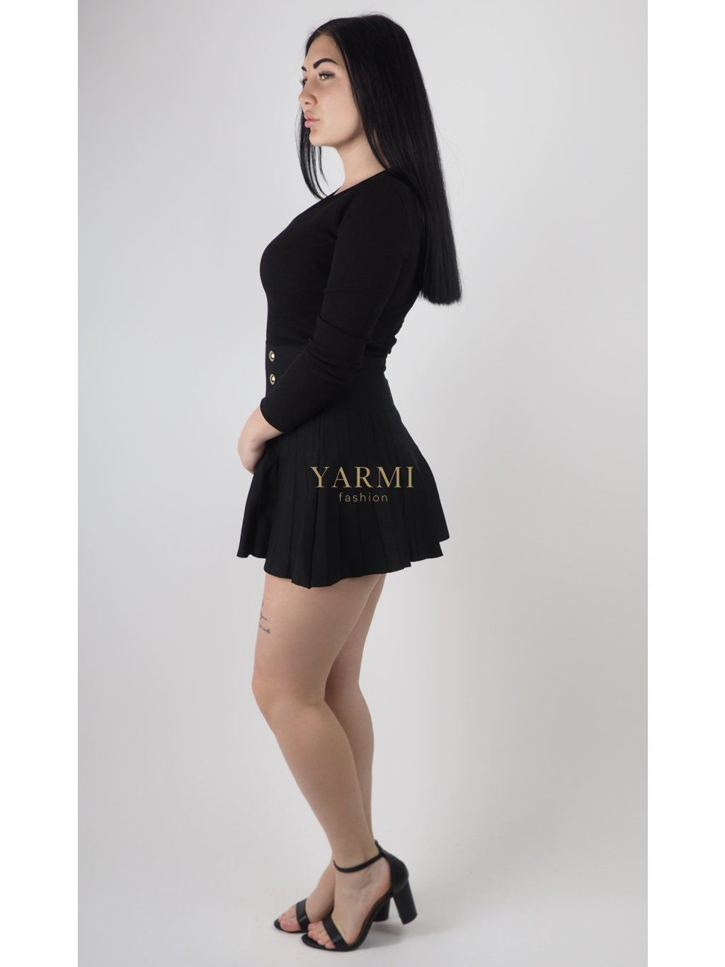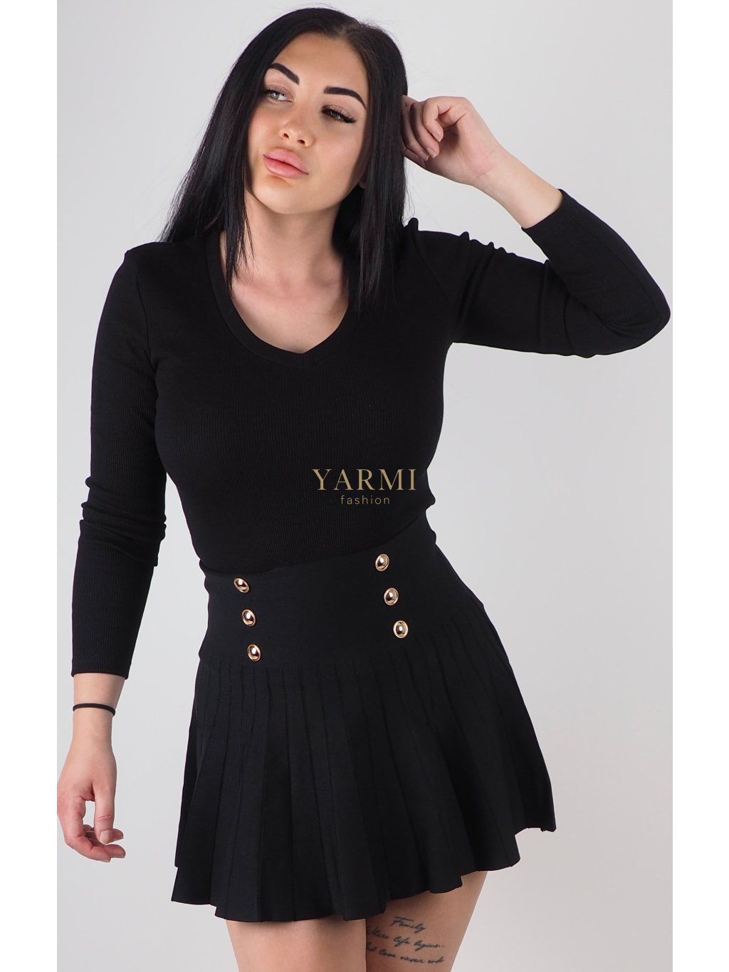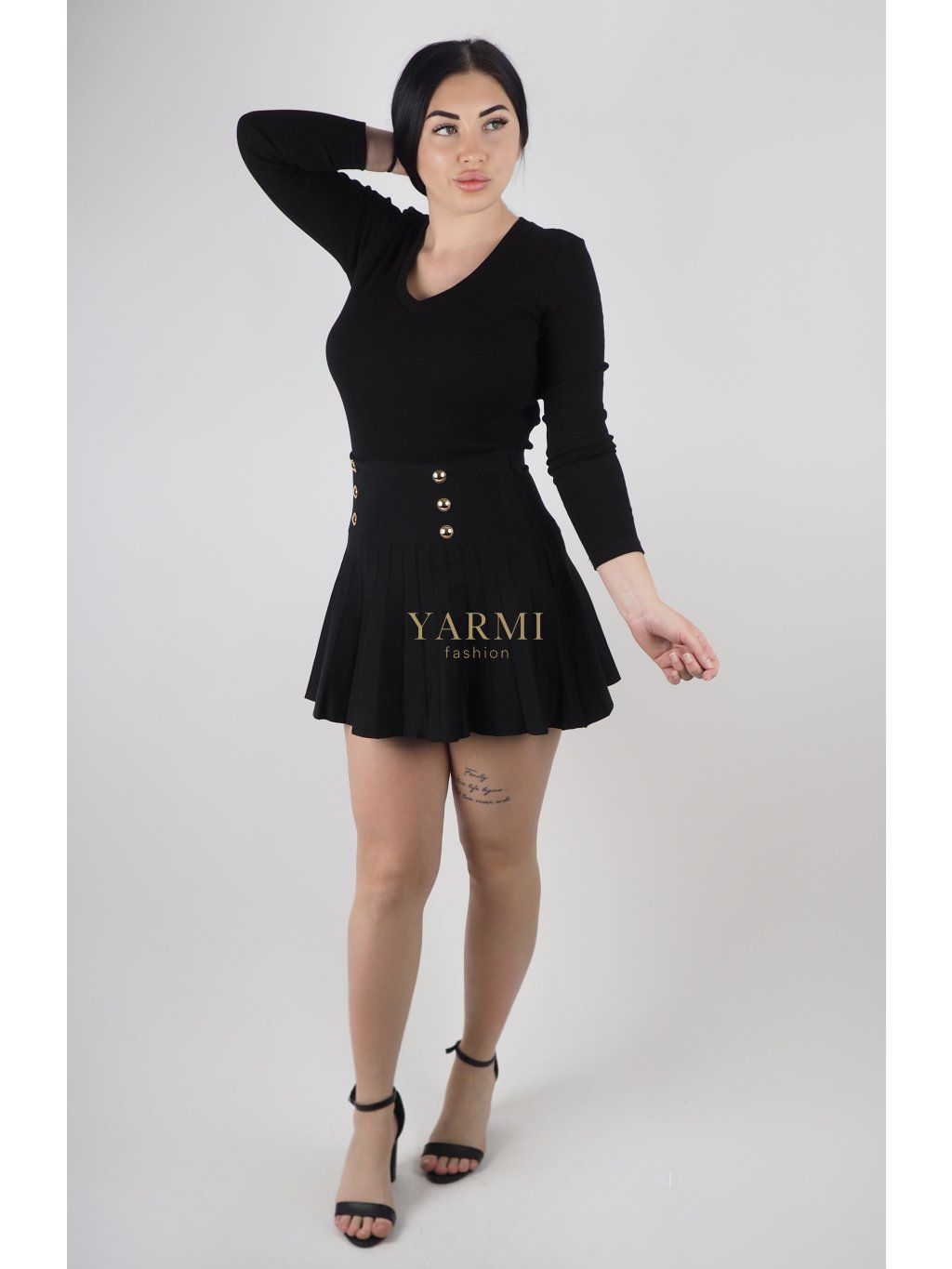 Miery modelky na fotografiách sú: ramená – 42 cm, prsia – 100 cm, boky – 100 cm, výška 173 cm. Na sebe má veľkosť M/L.