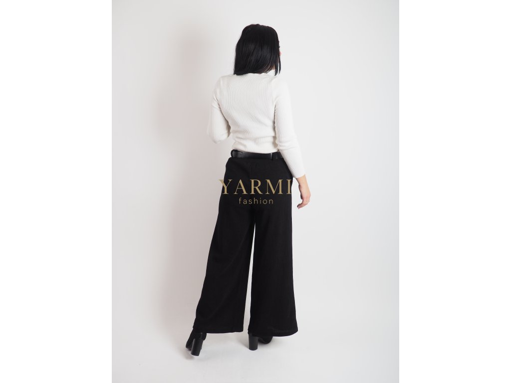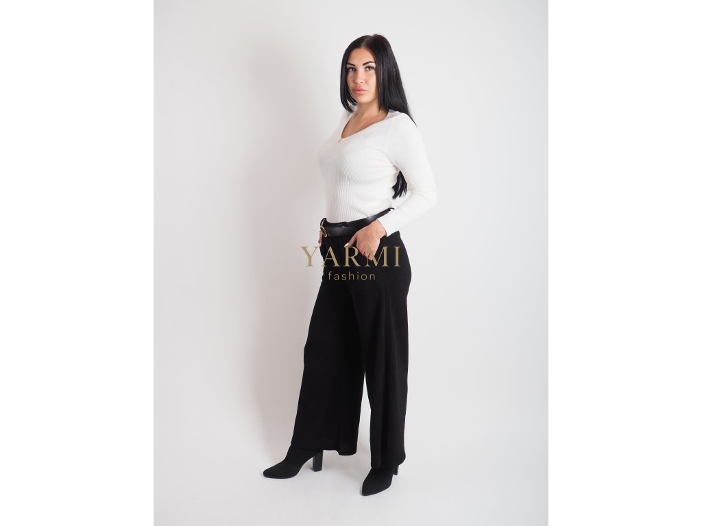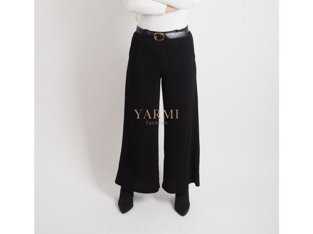 Tieto čierne pletené nohavice spájajú eleganciu a komfort v jednom.Majú široký strih, ktorý pôsobí moderne a lichotí postave.Pružný pás s opaskom zaručuje pohodlné nosenie a zvýrazní siluetu.Ideálne na bežné dni, do práce aj voľný čas – skvelo sa kombinujú so svetrom alebo blúzkou. Nohavice sú na gumičku a sú z hrubšieho materiálu.