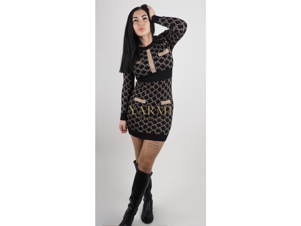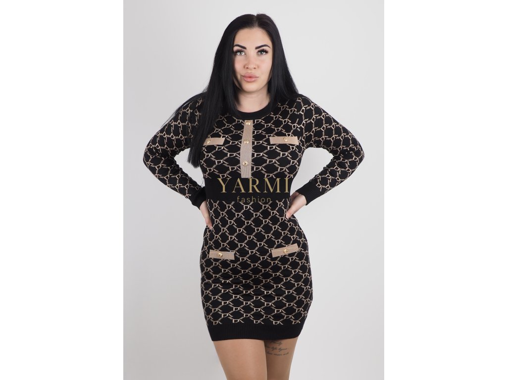 Dámske šaty Golden Pattern sú vyrobené z príjemného a pružného materiálu, ktorý sa pohodlne prispôsobí postave. Celoplošný zlatý vzor dodáva šatám luxusný a moderný vzhľad, zatiaľ čo ozdobné gombíky a dekoratívne prvky na prednej strane a vreckách pôsobia elegantne. Model sa oblieka cez hlavu, gombíky majú len dekoratívnu funkciu. Priliehavý strih a dlhé rukávy robia zo šiat ideálny kúsok na bežné nosenie aj večerné príležitosti.