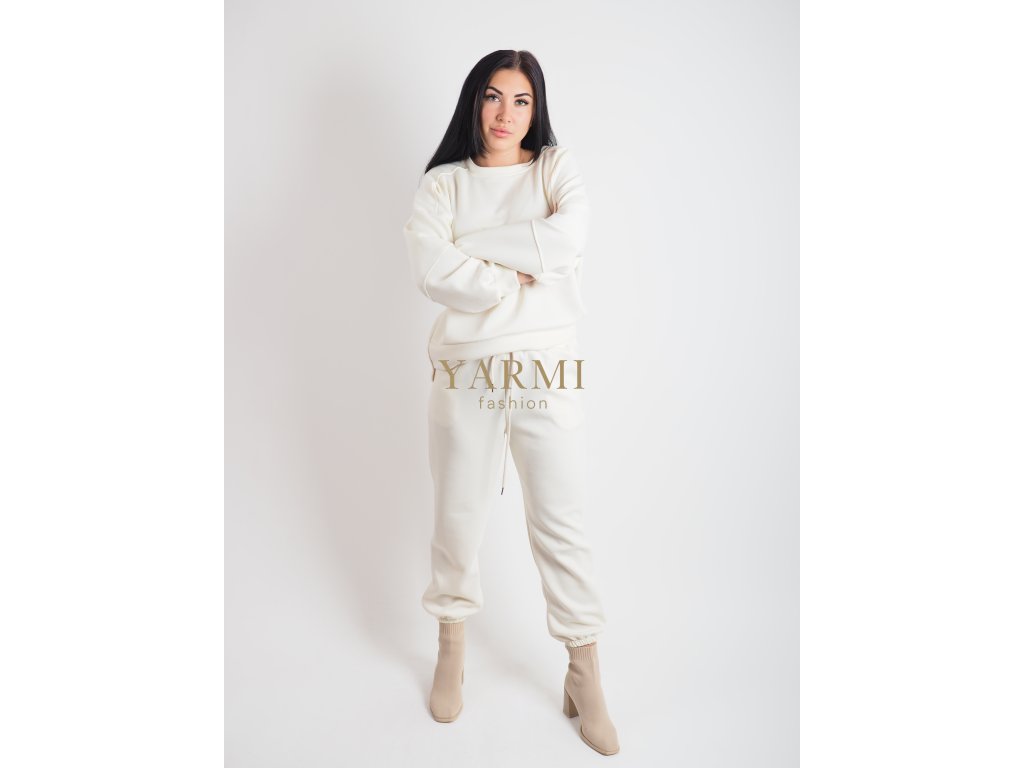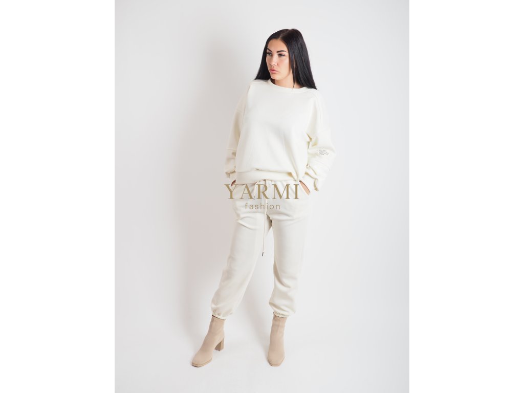 Dámsky komplet v krémovej farbe z príjemného a mäkkého materiálu. Mikina s minimalistickým strihom a nohavice so sťahovaním v páse a zakončením do patentu. Skvelý outfit na bežné dni, cestovanie aj domáce pohodlie. Mikina je oversize. Nohavice sú na gumičku.