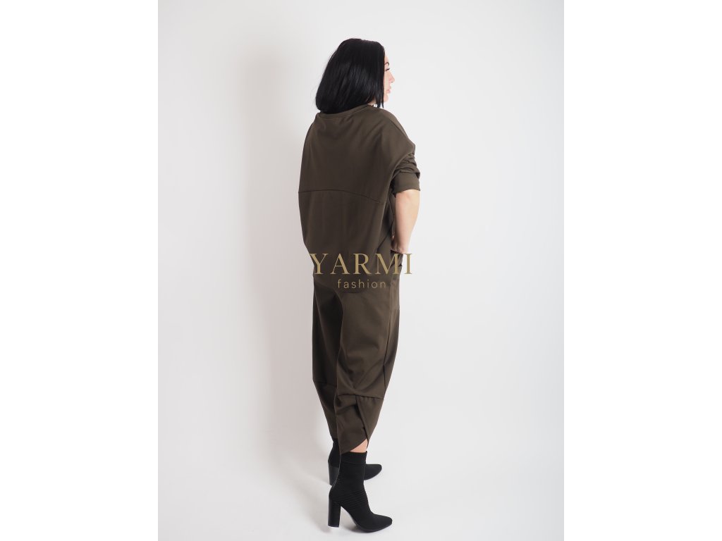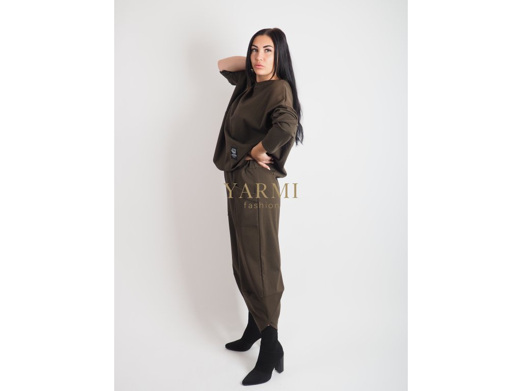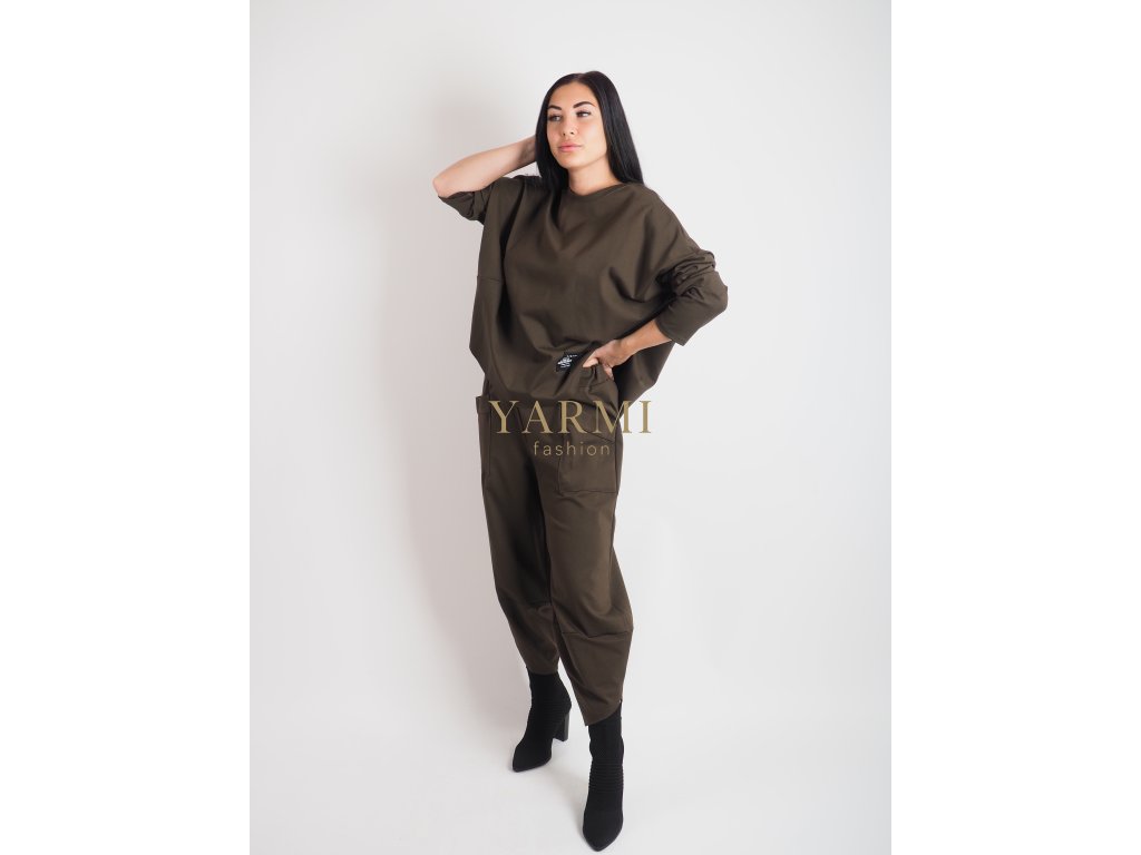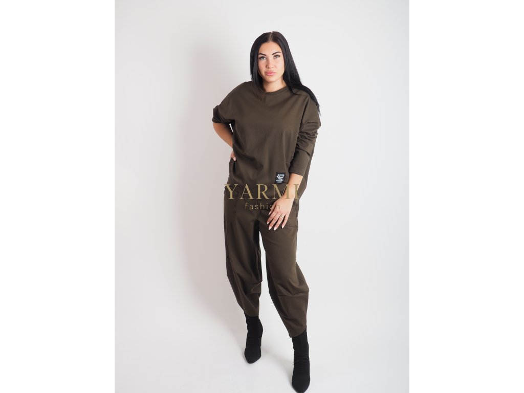 Ležérny dámsky komplet s voľnejším topom a nohavicami s vreckami v trendy khaki farbe. Kvalitný materiál zaručuje pohodlie, zatiaľ čo moderný strih pôsobí štýlovo a nadčasovo. Perfektná voľba na každodenné nosenie alebo neformálne stretnutia. Mikina je oversize.