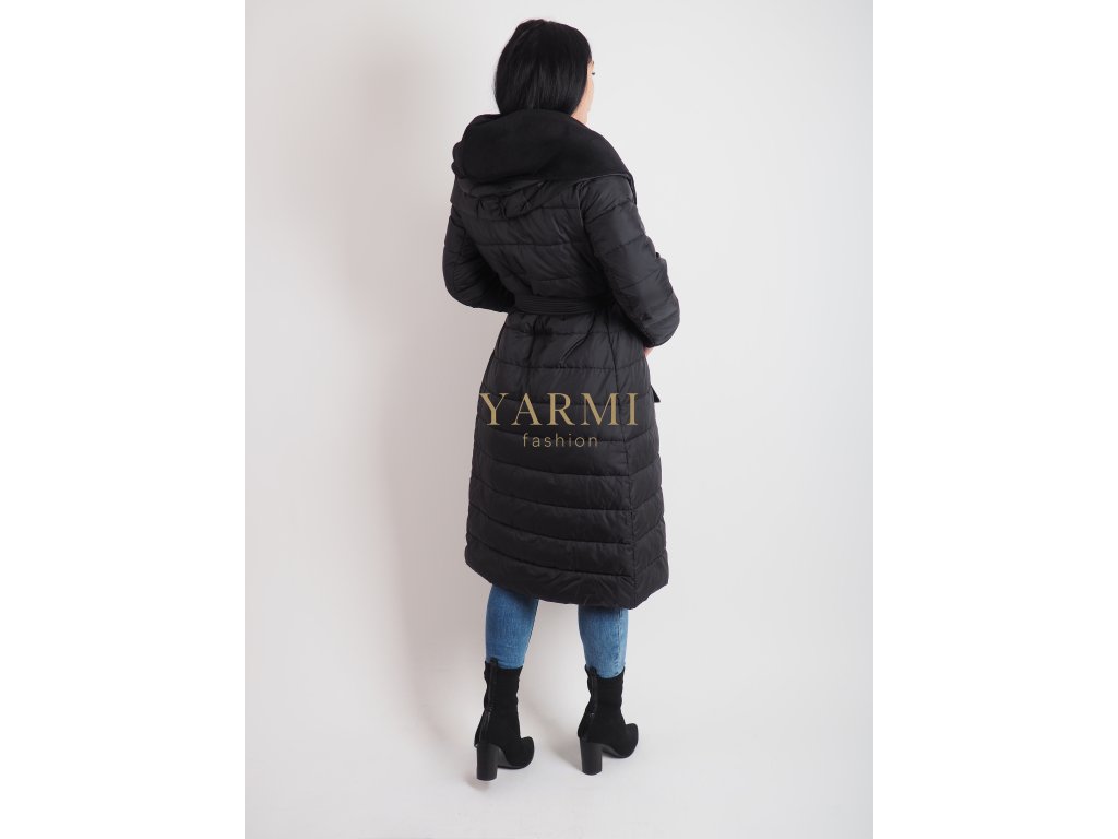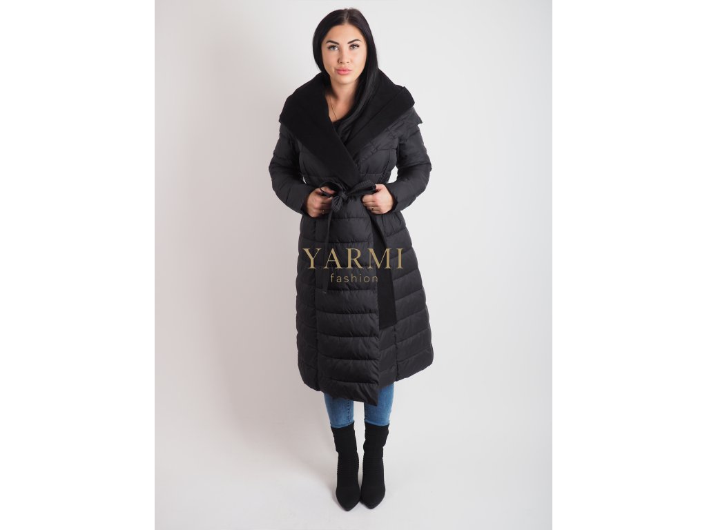 Luxusný zimný kabát v čiernej farbe s viazaním v páse.