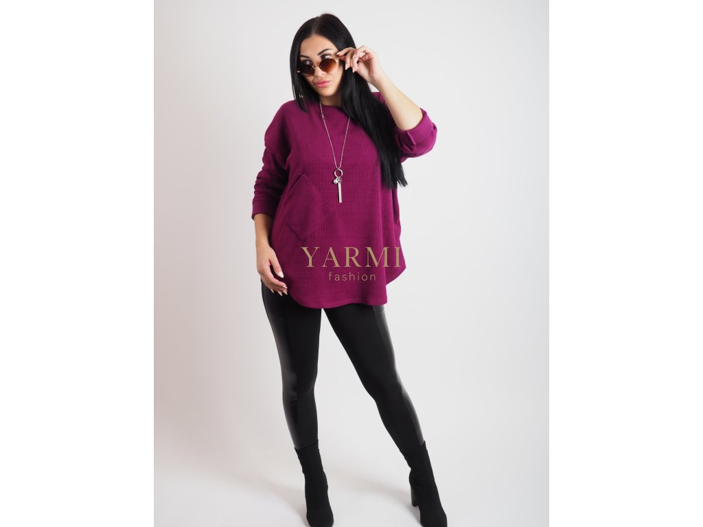 Moderný dámsky sveter s jemnou rebrovanou štruktúrou, ozdobným vreckom a dlhými rukávmi. Príjemný materiál a voľný strih zabezpečujú maximálne pohodlie. Skvele sa kombinuje s legínami, džínsami či sukňou – ideálny na bežné nosenie aj do práce.