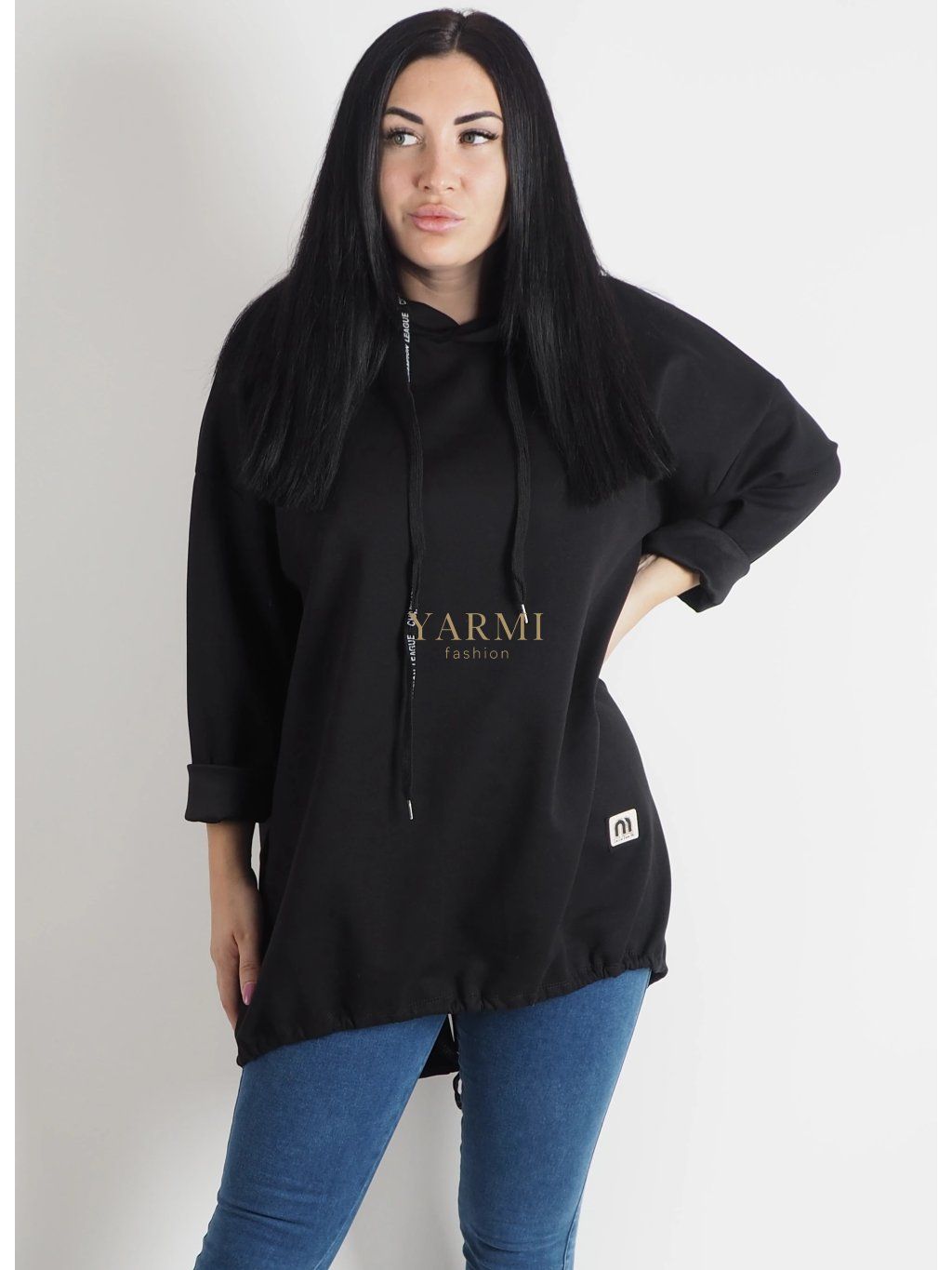 Dámska dlhšia čierna mikina s kapucňou a sťahovaním na zadnej strane, ideálna na pohodlné každodenné nosenie.