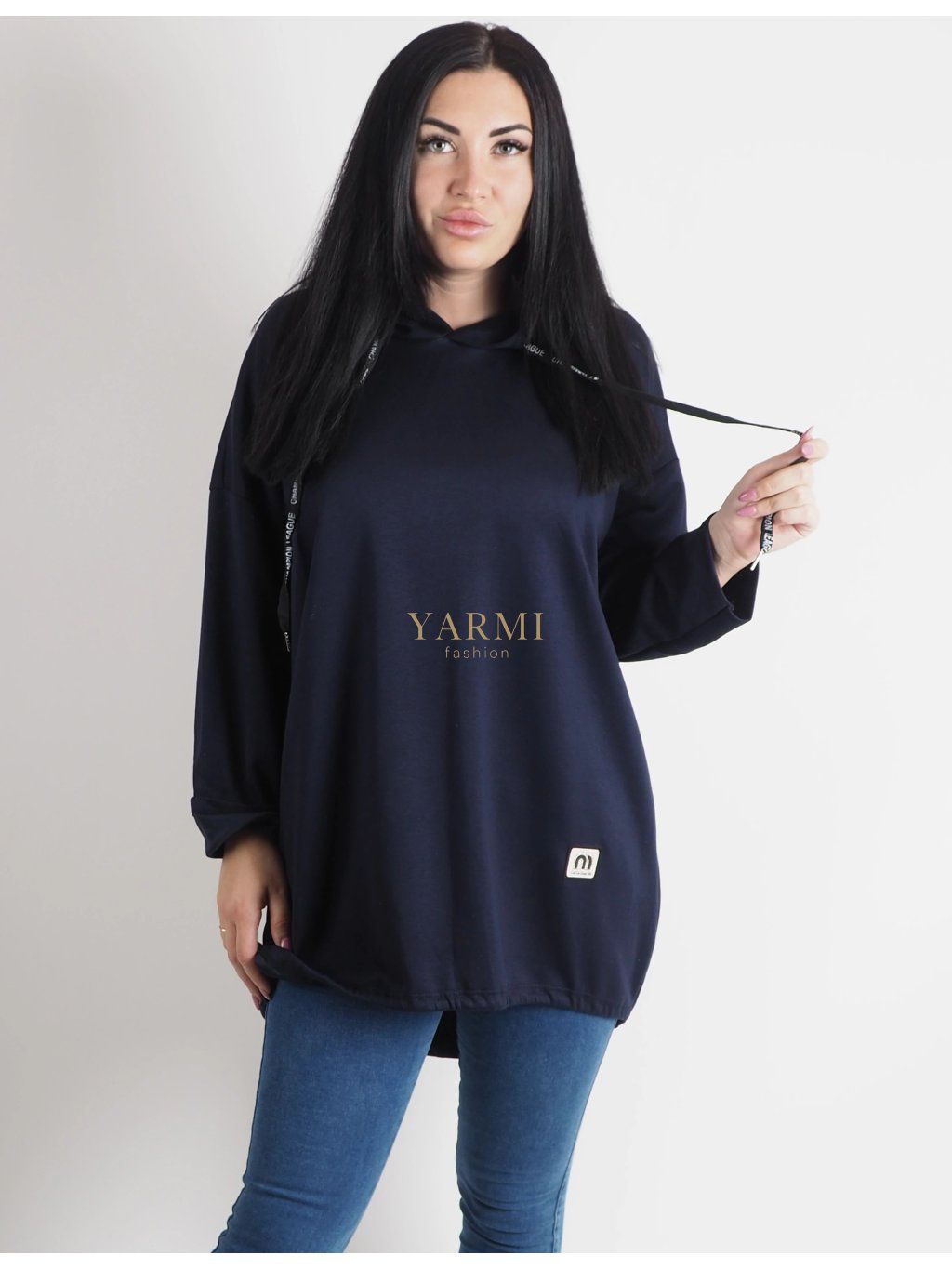 Dámska dlhšia tmavomodrá mikina s kapucňou a sťahovaním na zadnej strane, vhodná na pohodlné každodenné nosenie.