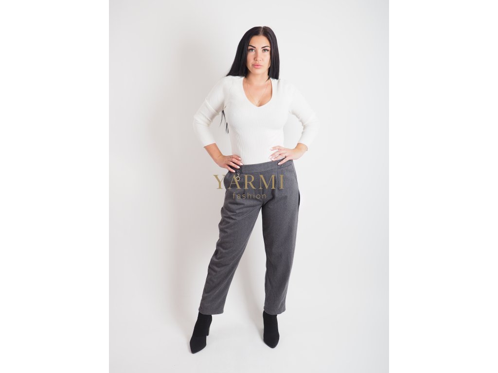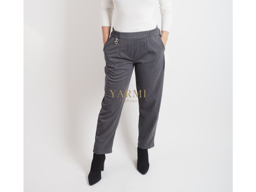 Sivé nohavice v modernom, voľnejšom strihu so zaujímavým detailom pri vrecku.