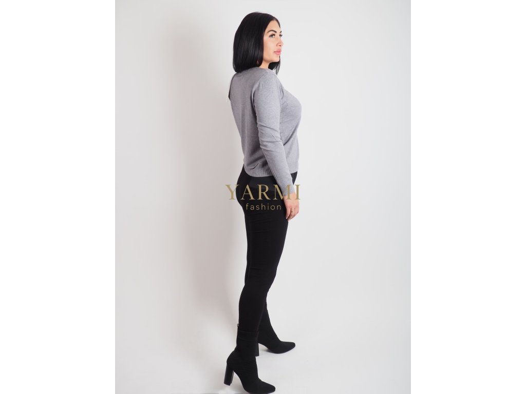 Jednoduchý dámsky sveter v sivej farbe, vyrobený z tenkého, príjemného a elastického materiálu, ktorý zabezpečuje komfort pri nosení. Sveter je ľahký a vhodný na každodenné nosenie.