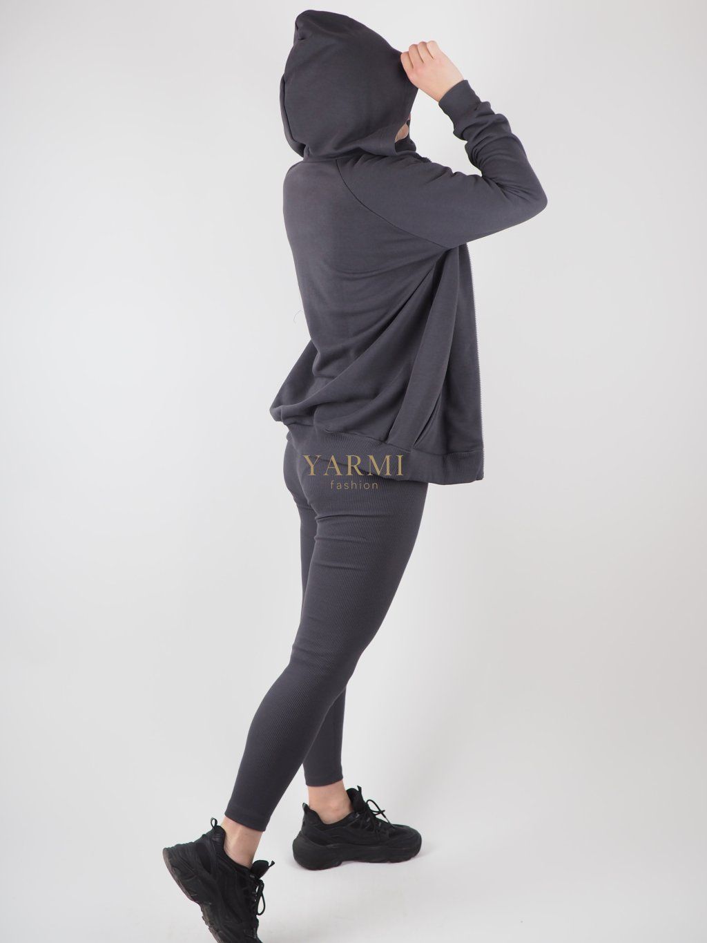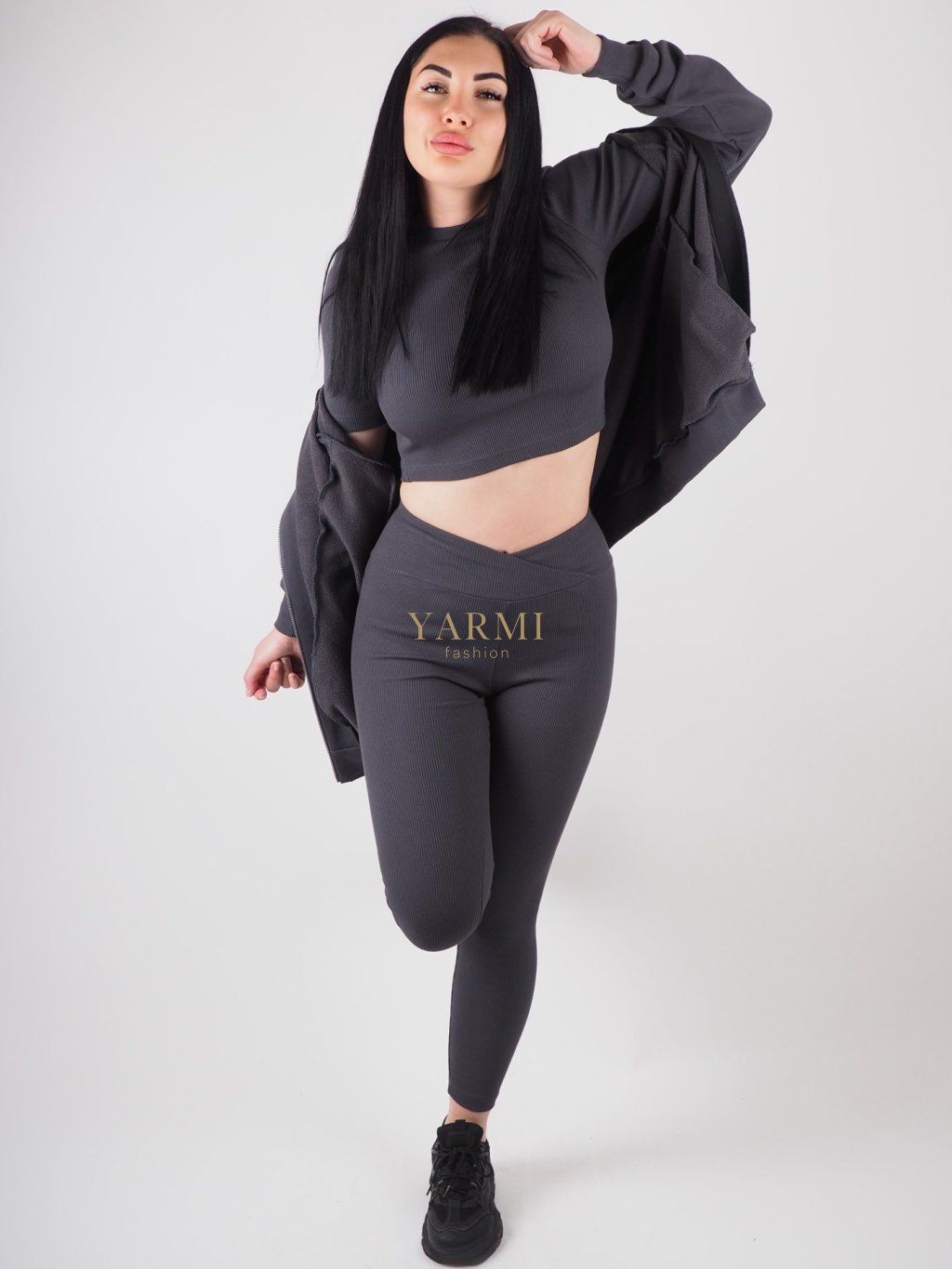 Moderný dámsky trojdielny komplet Nova v tmavosivej farbe pozostávajúci z legín, crop topu a mikiny. Štýlový a pohodlný outfit ideálny na každodenné nosenie aj aktívny životný štýl.