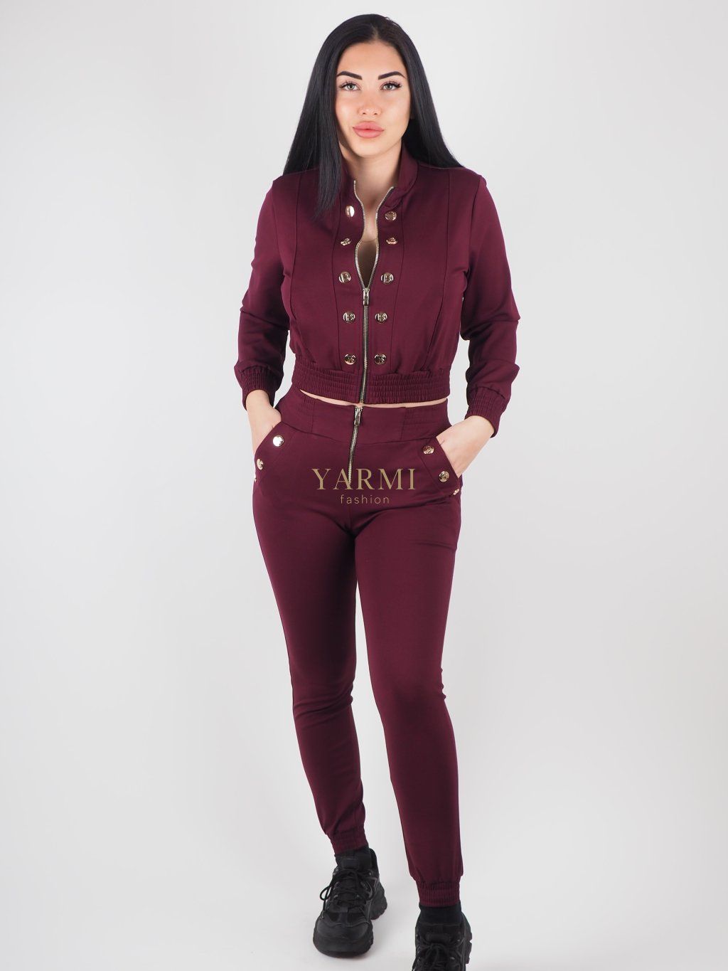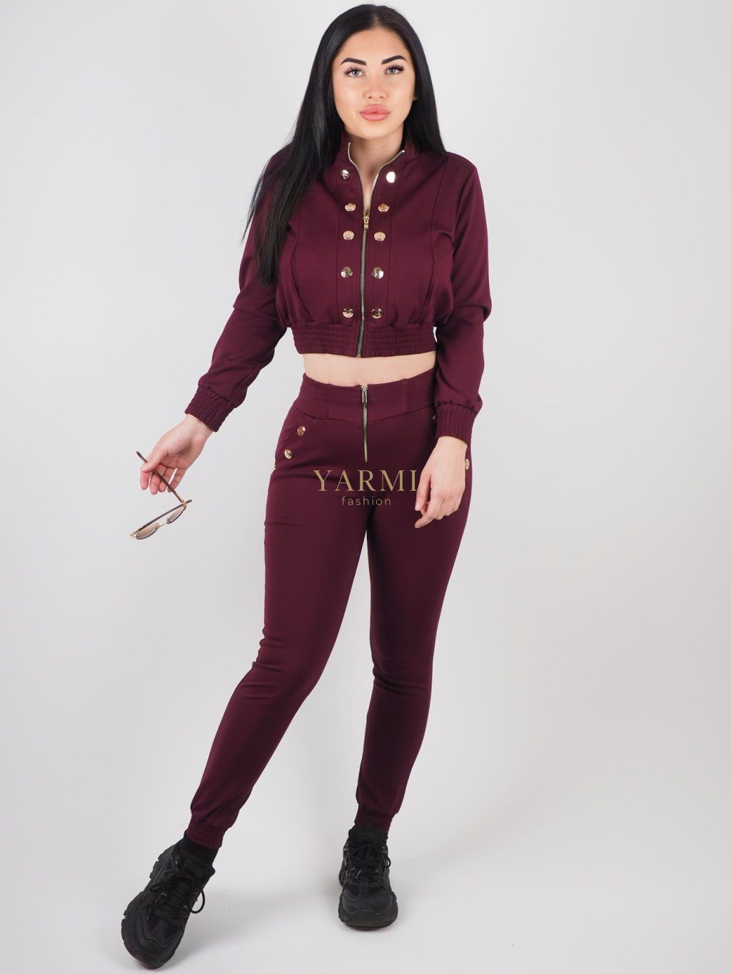 Elegantný dámsky komplet Milano v bordovej farbe pozostávajúci zo štýlovej bundy a nohavíc. Luxusné detaily v podobe zlatých gombíkov dodávajú outfitu sofistikovaný a výrazný vzhľad.