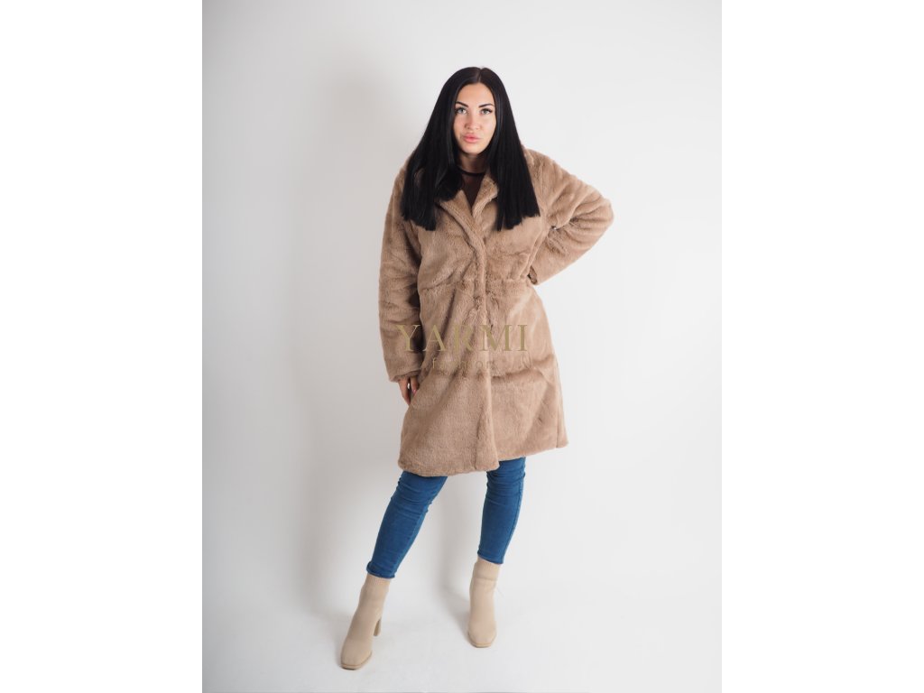 Dlhý cappuccino kožuch z mäkkej umelej kožušiny, príjemne hrejivý a ideálny na zimné outfity.