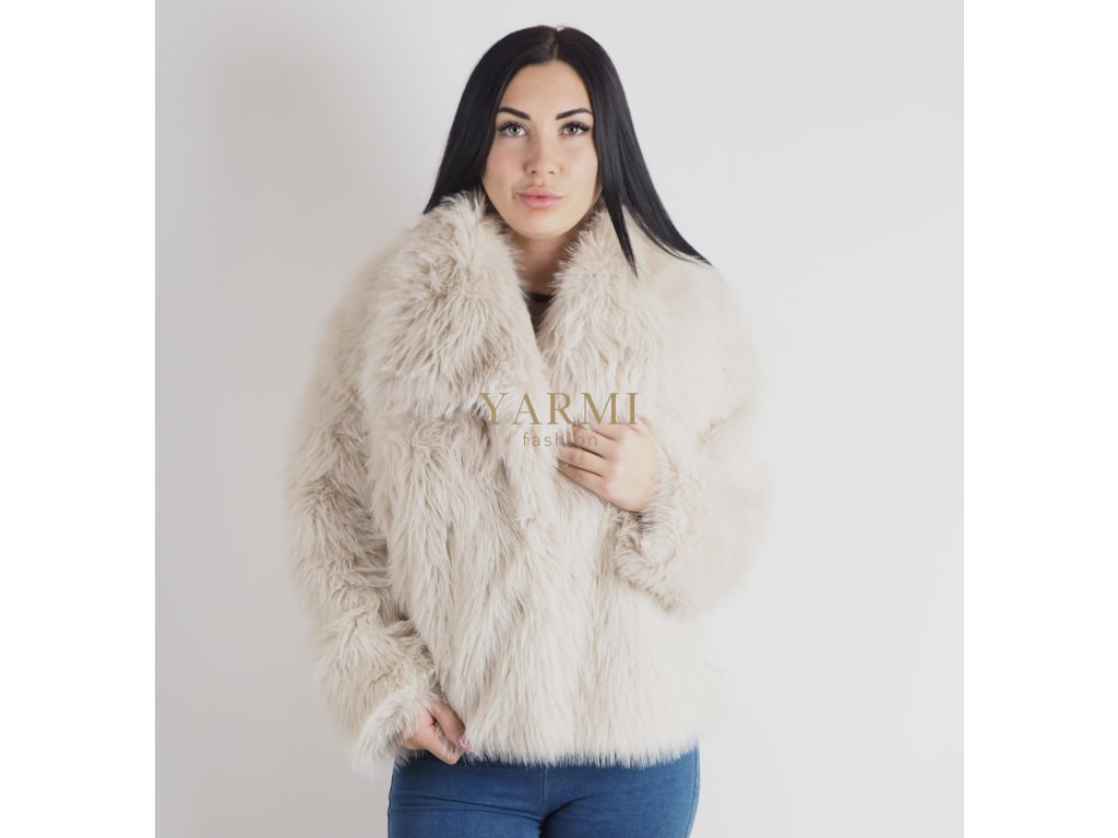 Krátky béžový kožuch z umelej kožušiny s bohatým chlpatým efektom, ideálny na štýlové zimné outfity.