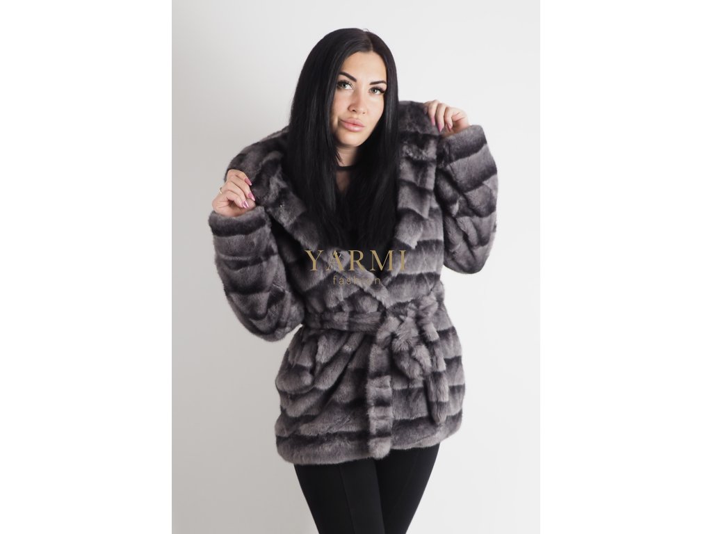 Tento šedý kožuch z mäkkej umelej kožušiny má luxusný pruhovaný efekt a viazanie v páse, ktoré krásne formuje siluetu. Je hrejivý, pohodlný a ideálny na zimné dni aj štýlové večerné outfity. Zapínanie je na cvoky. Miery modleky na fotografiách sú: ramená - 42 cm, prsia - 100 cm, boky - 100 cm, výška 173 cm.